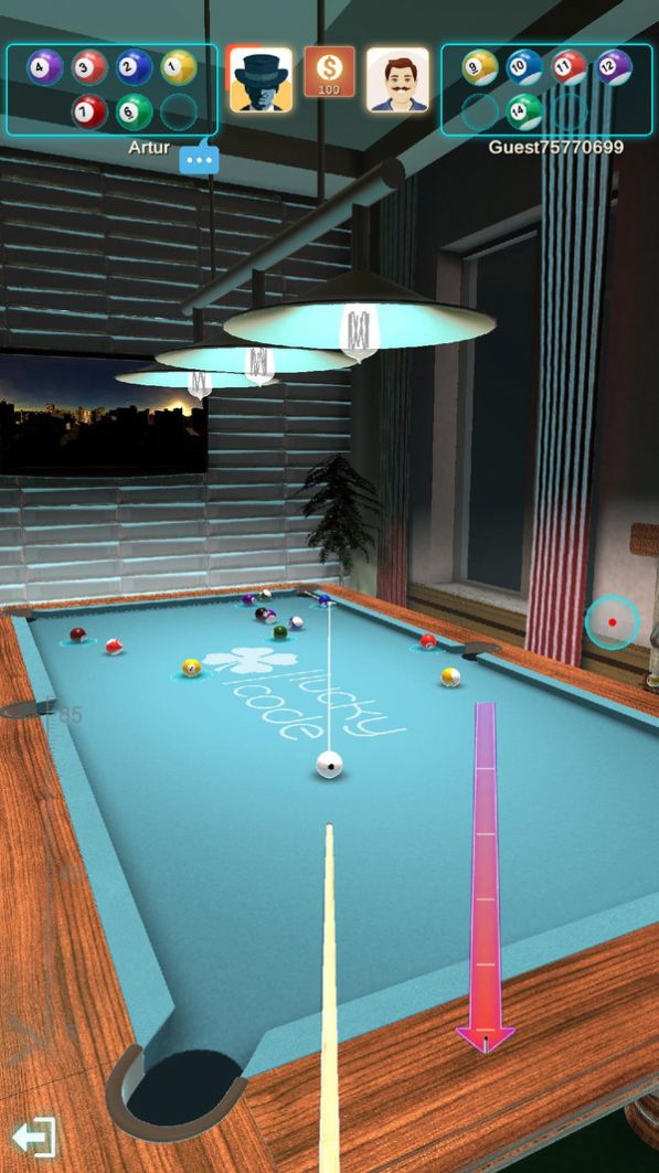 2、游戏采用全新的3D画面打造而成,游玩台球时可以随意的切换视角,然后控制好力度和角度就能击球了。