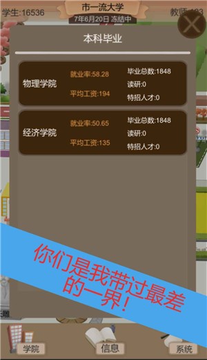 1.在游戏中你需要让自己的老师们是厉害的,努力的培养学生也是很不错的,有好的大学考中,你的学校是很轻松的,你可以查看学校的基本情况;