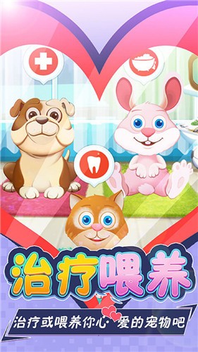 1.在游戏中你将开设一家宠物医院,救治和照顾各种不同的宠物,完成任务赢得奖励。