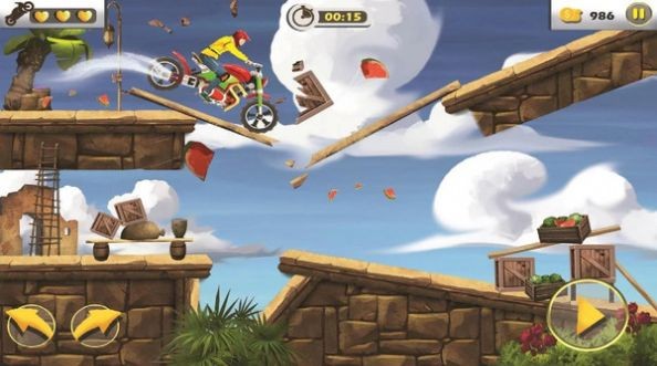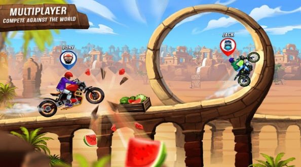 比赛中,玩家驾驶一辆炫酷的摩托车,驰骋在地图上,地图上有许多障碍,