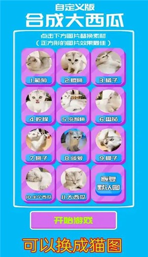 自定义合成大西瓜是一款合成的游戏,自定义合成大西瓜的画风整体是简约的,游戏在最开始的时候玩家可以随意的设置自己喜欢的图片进行添加去合成。可以把里面的各种水果的图片轻松换成其他素材啦,一定要用1:1的正方形图片哦,丰富的合成让完事让玩家感受更多的欢乐,多种游戏方式解锁新的冒险过程,全新的游戏玩法感受不同的游戏过程,指尖操作带给你无限欢乐,其中的许多字符就可以由您自己缓慢地获取,非常轻松的休闲,还可以让你有更多的创造性。