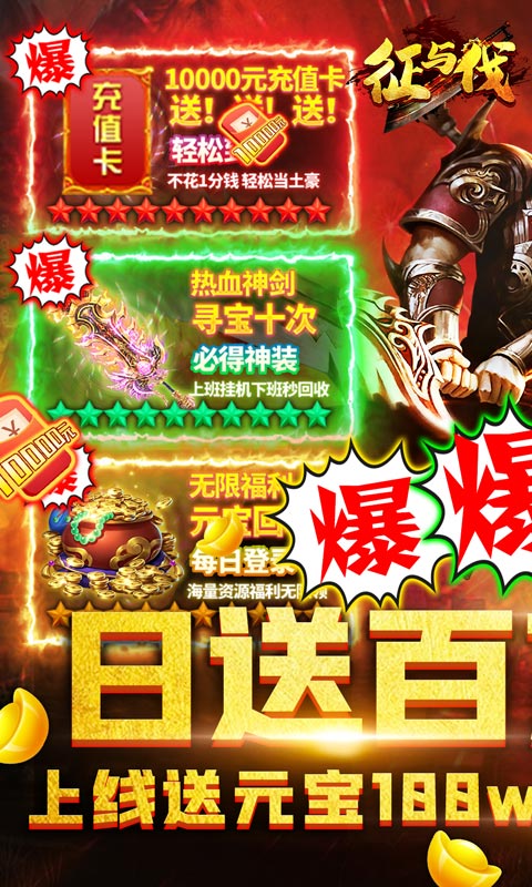 《征与伐(爆百万充值)》是一款全新的传奇动作手游,打boss爆充值卡,能激活每天累充和福利累计充值!快邀请兄弟齐聚沙城,称霸全服!