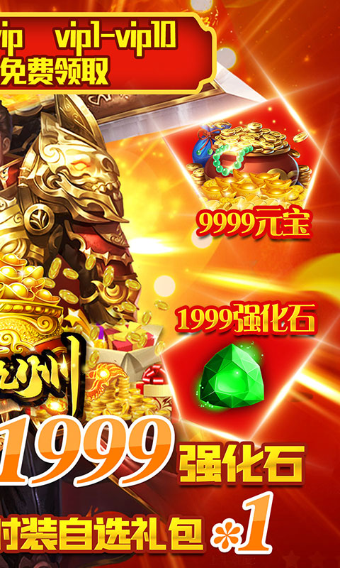 1.上线即送满级vip、五百万铜币、12888元宝、时装自选礼包*1!
