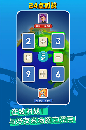 语音对战王是一款休闲益智的答题对战游戏,在游戏中玩家需要利用加减乘除让等式等于24即可,和你对战的玩家可能来着全国各个地方,系统随机为你挑选对手,先让等式等于24的玩家胜利,需要玩家集中注意力,考验玩家的计算能力。玩游戏需要你掌握好技巧,正确调整数字顺序,才可以在最快的时间内赢得比赛。每天登录游戏还可以获得奖励,还有各种完成游戏可以获得的丰厚奖励。游戏玩法众多,在线模式和单机模式任你选择,还可以选择和多人一起抢答的玩法。还可以和朋友一起参加抢答的答题,题目都是有趣不枯燥的,还可以发语音研究怎么玩游戏更快完成游戏。游戏既可以涨知识,还可以在休闲时间放松一下,解压,缓解不开心。这里是小编为大家带来的语音对战王破解版,拥有无限的金币,玩家可以任意购买想要的物品,欢迎感兴趣的朋友前来下载体验。